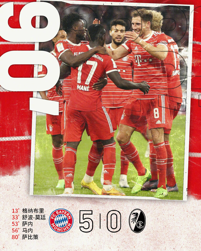 唯彩看球讯 北京时间10月17日1时30分,德甲第10轮,拜仁慕尼黑主场5-0大胜弗赖堡。萨内、格纳布里和舒波-莫廷都分别传射建功,马内和萨比策进球,拜仁排名超越弗赖堡升到积分榜第二,落后榜首球队柏林联4分。