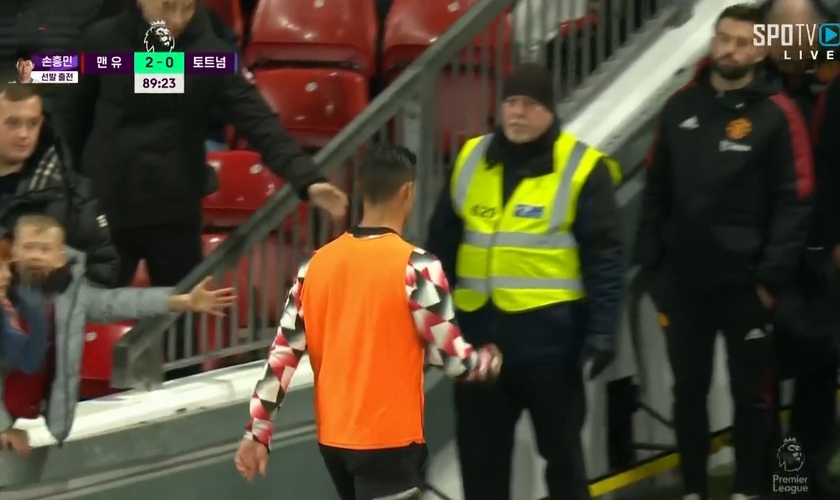 唯彩看球讯 英超第12轮,曼联主场2-0热刺,比赛进入补时前,C罗直接走向球员通道。