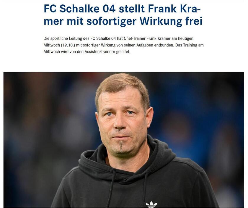 唯彩看球讯 沙尔克俱乐部官方宣布主帅克拉默被解雇,今天的训练课将由助教团队主持。今年6月7日,克拉默被任命为重返德甲的沙尔克的主帅,他在球队帅位上仅仅待了4个月时间。