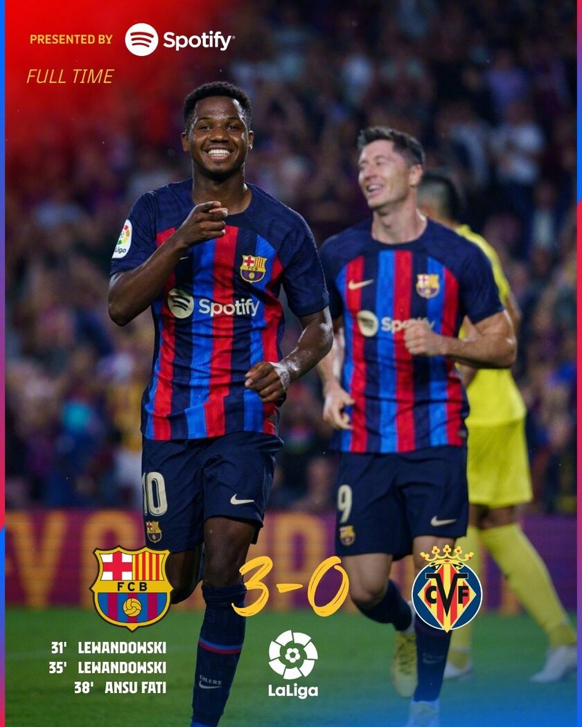 唯彩看球讯 北京时间10月21日凌晨3点,西甲第10轮,巴塞罗那主场3-0大胜比利亚雷亚尔,莱万梅开二度,法蒂脚后跟破门。