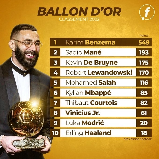 唯彩看球讯 2022金球奖得分公布,本泽马549分一骑绝尘!本泽马今年对第2名的领先优势是历史上第二大,金球奖历史上前二得分差距最大的一次是2016年C罗夺金球奖。