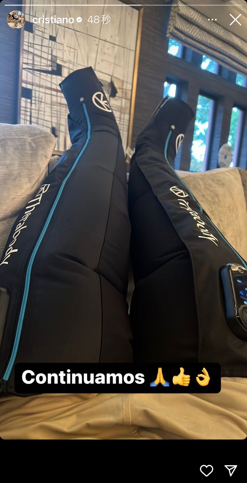 唯彩看球讯 C罗更新了个人的ins。发布了一张他两条腿的照片,并配文道:“我们继续🙏👍👌”