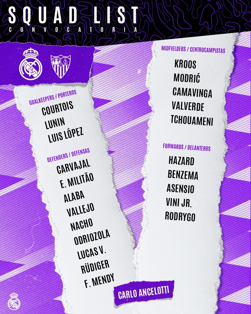 后卫:卡瓦哈尔、米利唐、阿拉巴、巴列霍、纳乔、奥德里奥索拉、巴斯克斯、吕迪格、门迪