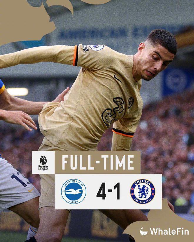 唯彩看球讯 北京时间10月29日晚22点,英超第14轮,切尔西客场1-4不敌布莱顿。开场仅5分钟,罗萨德破门先拔头筹,随后切尔西的奇克和查洛巴先后自摆乌龙,切尔西半场0-3落后布莱顿。下半场刚开场加拉格尔助攻哈弗茨头球得手扳回一球,但补时阶段布莱顿的格罗斯补射破门锁定4-1的比分。切尔西最终客场1-4输给布莱顿,波特上任后蓝军首败。切尔西输球后继续排名第五,布莱顿升至第七。