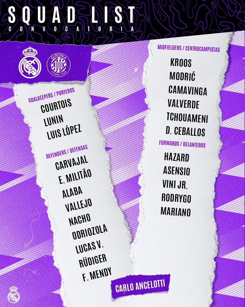 后卫:卡瓦哈尔、米利唐、阿拉巴、巴列霍、纳乔、奥德里奥索拉、巴斯克斯、吕迪格、门迪