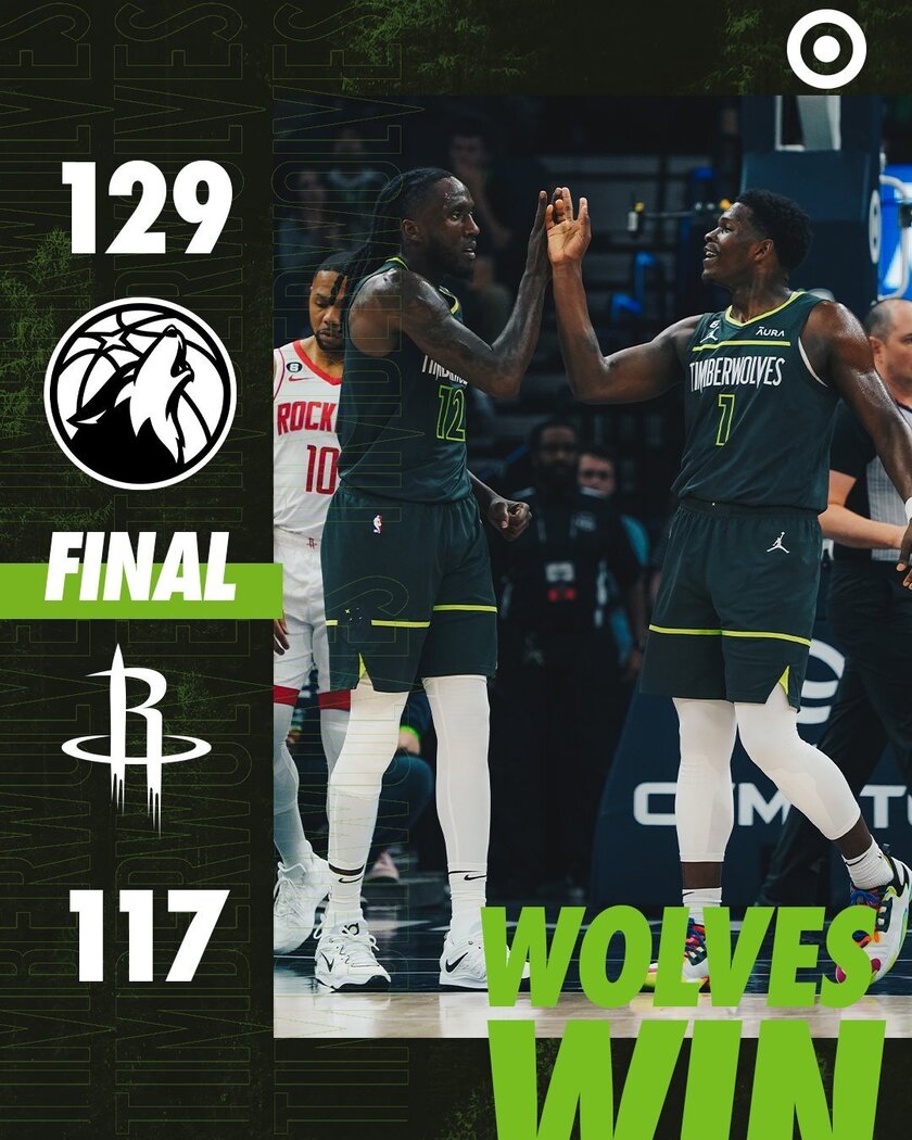 第四节,火箭队连追7分,他们以95-110落后。安德森三分还击,拉塞尔上篮得手,森林狼队迅速稳住局势。伊森连追5分,马修斯又中三分,火箭队再次追近。拉塞尔打3分成功,普林斯底角投中三分,第四节还有3分55秒时森林狼队以123-105领先。之后的比赛火箭队无力反攻,森林狼队以129-117获胜。