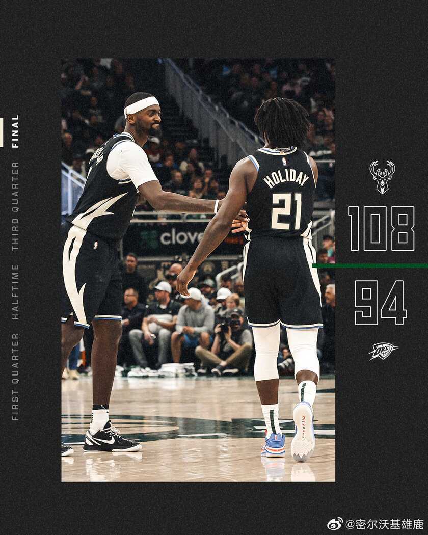 唯彩看球讯 NBA新赛季常规赛,密尔沃基雄鹿队保持不败。虽然字母哥休战,但大洛得到25分,霍勒迪送出10分和13次助攻激活球队进攻,雄鹿队依靠第二节攻势确立两位数领先,他们在主场以108-94战胜俄克拉荷马城雷霆队。雄鹿队拿到9连胜,雷霆队遭遇2连败。