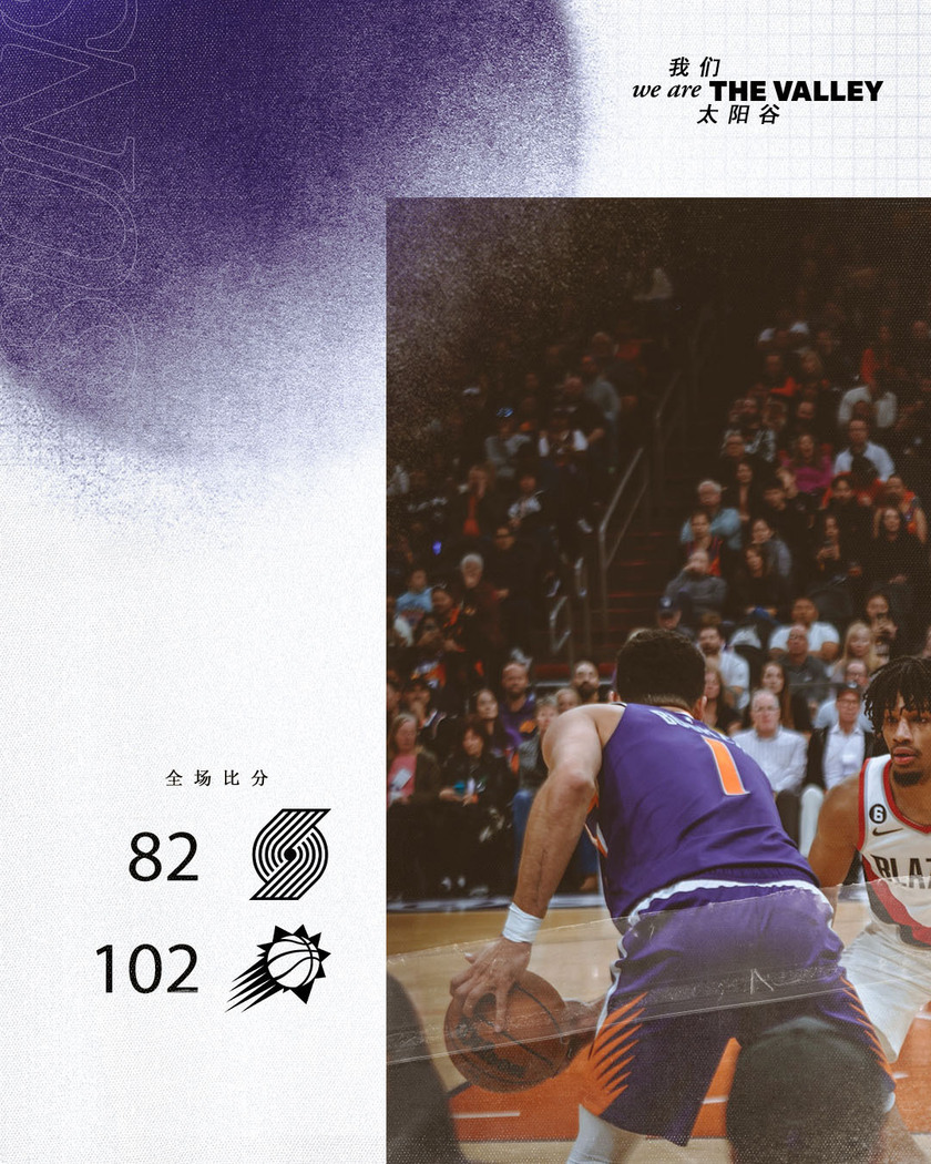 唯彩看球讯 NBA新赛季常规赛,菲尼克斯太阳队重拾胜利。布克得到24分,保罗得到15分、5个篮板和4次助攻,他们率队上半场就确立大比分优势,太阳队在主场以102-82大胜复仇波特兰开拓者队,夺回西部榜首宝座。本场比赛双方所有出场球员均有得分。