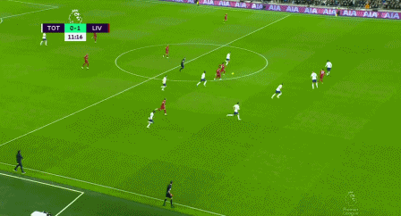 第11分钟,罗伯逊左路45度传中,禁区内努涅斯停球后分球,无人防守的萨拉赫停球后12码处左脚射门,球飞入右下角,热刺0-1利物浦。
