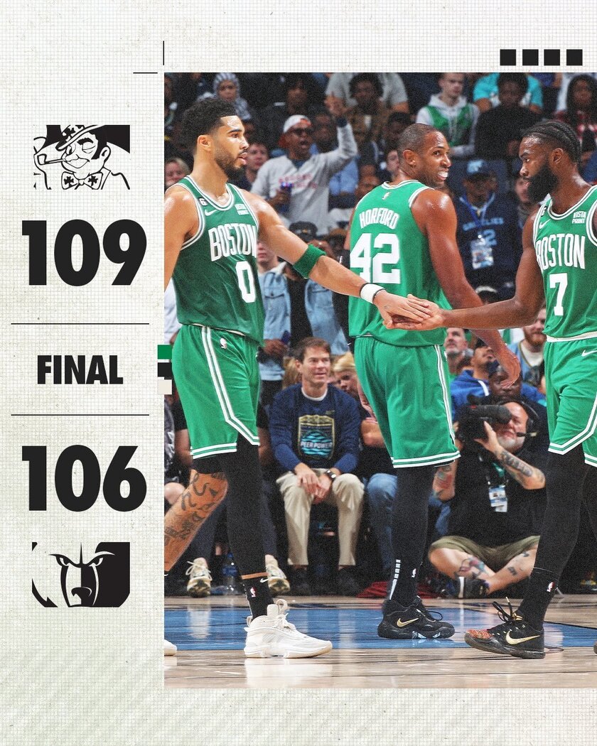 第四节,布朗上篮得手,孔查尔再中三分,布朗又拿4分,塔图姆和斯马特各得3分,他们率队打出14-2的小高潮,第四节还有5分25秒时凯尔特人队以100-90领先10分。琼斯跳投暂时止血,塔图姆连投带罚又拿4分,凯尔特人队以105-94领先。灰熊队非常顽强再次反攻,莫兰特命中三分,他率队打出9-0的反击波,第四节还有17.3秒时灰熊队追至103-105。威廉姆斯两罚全中,贝恩弧顶投中三分,灰熊队只落后1分。塔图姆两罚全中,凯尔特人队以109-106获胜。