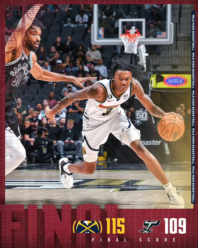 第四节,乔丹扣篮得手,理查德森和约翰逊各中三分,他们率队打出12-4的反击波,马刺队以101-100反超。之后两队交替领跑,约基奇扣篮得手,波普三分中的,掘金队以109-105领先。琼斯走步失误,穆雷上篮得手把优势拉开到6分。瓦塞尔和理查德森追回4分,约基奇中投得手,掘金队以113-109领先。理查德森失误,戈登扣篮得手,掘金队以115-109获胜。