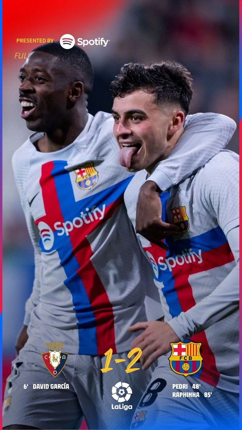 唯彩看球讯 北京时间11月9日凌晨4点30分,西甲第14轮,巴塞罗那客场2-1逆转奥萨苏纳。大卫-加西亚为奥萨苏纳打进争议进球,莱万、皮克被罚下,佩德里和拉菲尼亚破门助巴萨逆转。