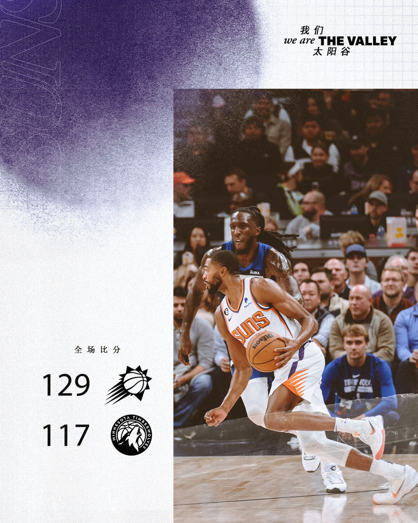 唯彩看球讯 NBA常规赛继续进行,菲尼克斯太阳队重拾胜利。布克得到32分和10次助攻,布里奇斯得到31分、9个篮板和5次助攻,他们率队前三节就确立大比分优势,太阳队在客场以129-117战胜明尼苏达森林狼队(5胜7负)。森林狼队遭遇2连败。