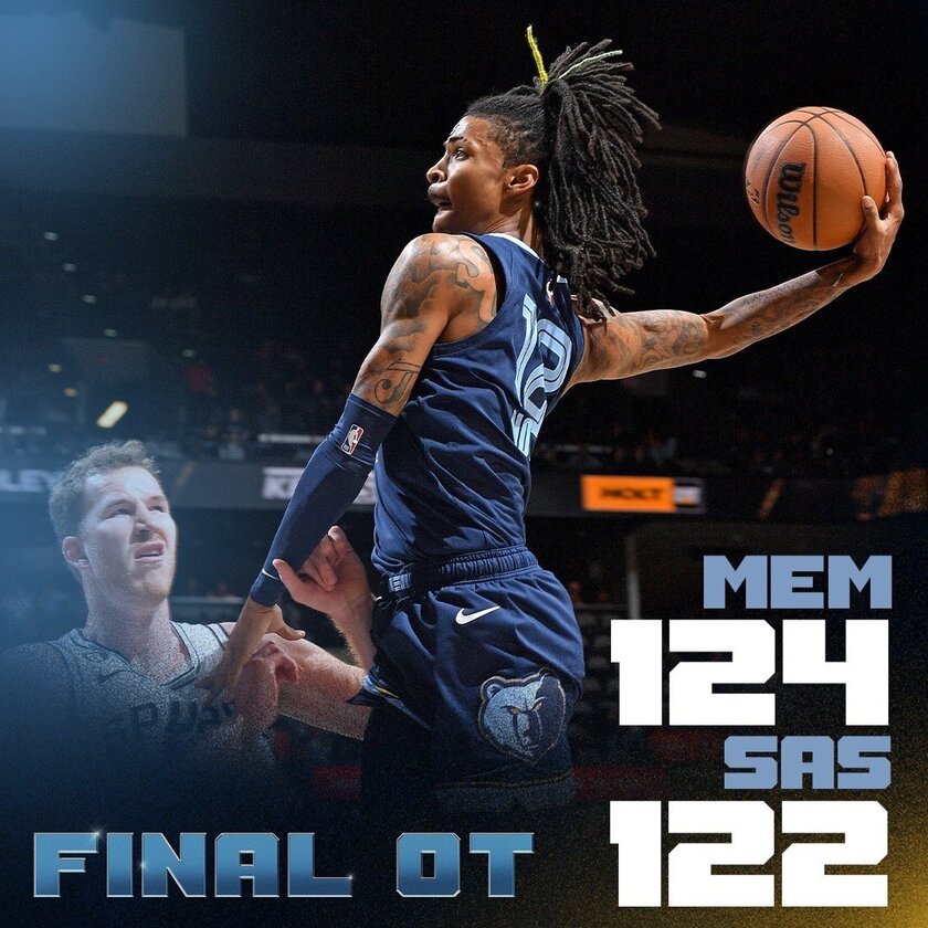 灰熊队在加时赛开始后连得5分领跑,珀尔特尔跳投命中,莫兰特连进两球率队又拿6分,灰熊队以123-114领先。索汉两次篮下打进,他率队连追8分迫近。莫兰特两罚一中,瓦塞尔左翼错失三分绝杀,马刺队以122-124惜败。