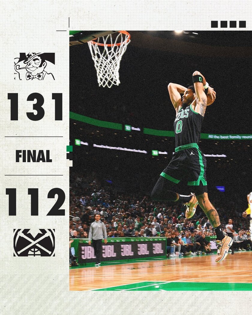 第四节,霍福德和塔图姆联手5分,绿军再次领先两位数。约基奇跳投还击,塔图姆罚中三球,霍福德再次开火又进2个三分球,凯尔特人队以111-95领先。约基奇和戈登追回5分,塔图姆跳投命中,威廉姆斯三分中的,第四节还有5分35秒时凯尔特人队以116-101领先。掘金队打得很顽强又追6分迫近,布朗三分中的,塔图姆连投带罚得到3分,斯马特、霍福德也轮流得分,第四节还有2分钟时凯尔特人队以127-109领先。掘金队换下主力缴械,凯尔特人队最终以131-112获胜。