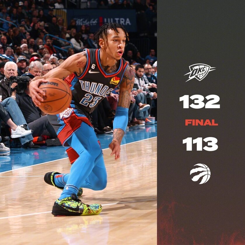 唯彩看球讯 NBA常规赛继续进行,俄克拉荷马城雷霆队止住连败。奥莫鲁伊替补得到22分,亚历山大得到20分,他们率队进攻多点开花,雷霆队8人得分上双,他们逐渐确立大比分优势,雷霆队在主场以132-113大胜多伦多猛龙队,雷霆队结束4连败。