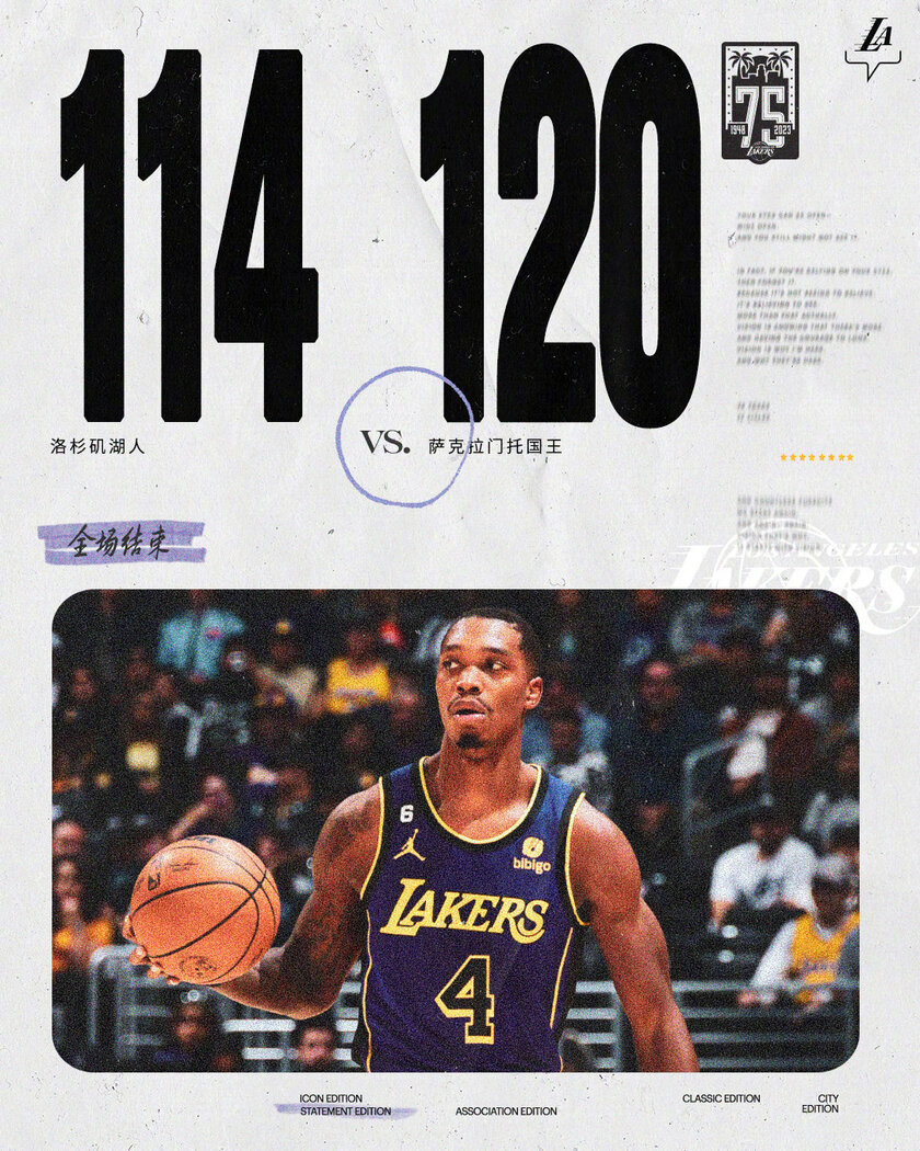 巴恩斯突破造成威少犯规,两罚全中,国王队追成114平。威少跳投不中,福克斯中投得分,国王队再次领跑。贝弗利弧顶三分不中,福克斯后仰跳投命中,第四节还有32秒时国王队以118-114领先。湖人队暂停后沃克三分不中,巴恩斯拿到篮板被犯规,两罚全中,国王队领先6分。湖人队连续抢投三分打铁,他们以114-120落败。
