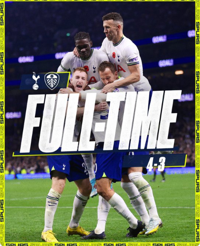 唯彩看球讯22/23赛季英超第16轮在新托特纳姆热刺球场展开角逐,热刺坐镇主场迎战利兹联。上半场萨默维尔首开纪录,凯恩扳平比分,罗德里戈反超,下半场本-戴维斯再度扳平,罗德里戈再入一球,本坦库尔梅开二度,亚当斯染红。热刺三度落后三度扳平,最终4-3逆转利兹联,热刺终结各项赛事两连败。