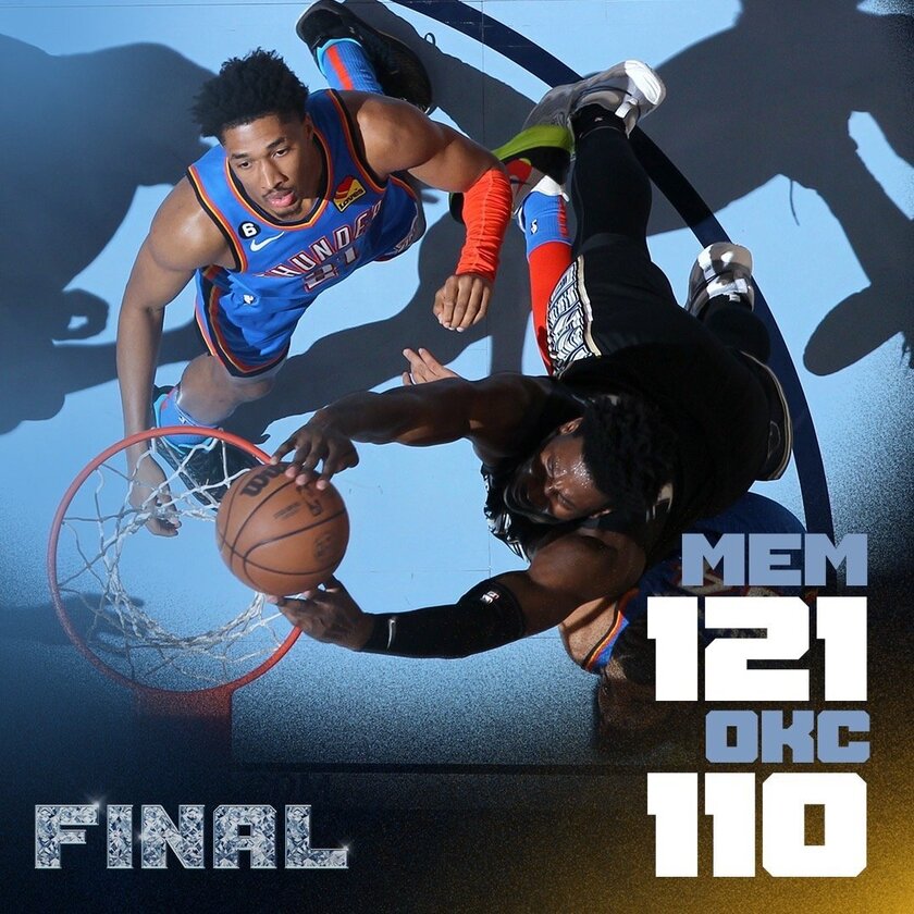第四节,维金斯扣篮得手,杰克逊连得5分扩大优势。吉迪和威廉姆斯追回8分,琼斯、杰克逊和罗迪联手6分,本节进行了5分钟时灰熊队以103-93领先10分。维金斯命中三分率队又追5分,莫兰特、孔查尔和布鲁克斯轮流得分,第四节还有1分40秒时灰熊队以111-99领先。最后时刻雷霆队无力回天,他们以110-121落败。