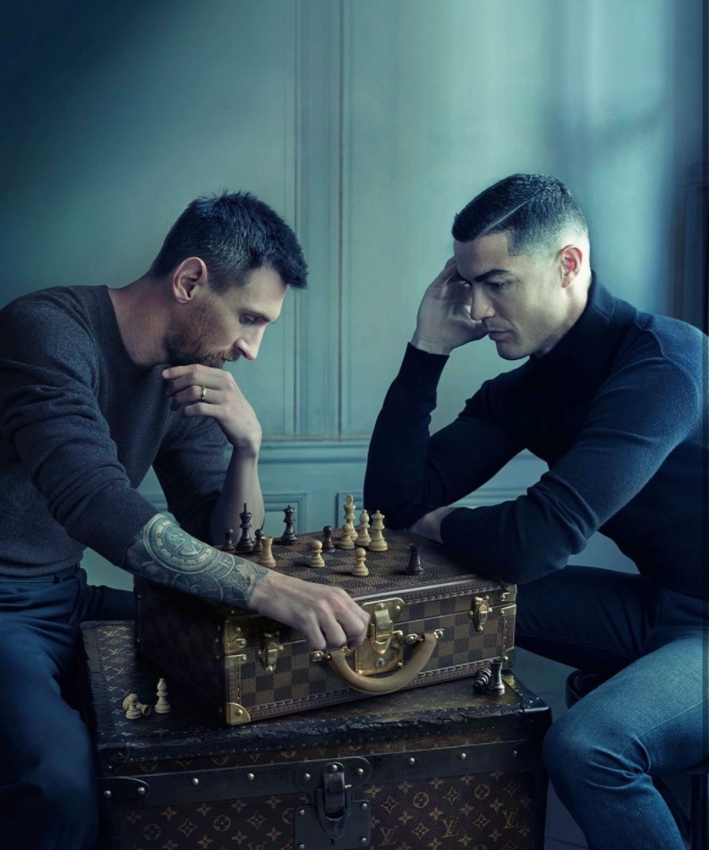 唯彩看球讯 梅西、C罗更新了自己的ins,晒出了二人共同为LV拍摄的广告大片,在图中梅西与C罗面对而坐,两人都看着眼前的棋盘沉思。