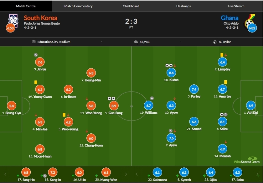 唯彩看球讯 在刚刚结束的世界杯小组赛中,韩国2-3加纳,两战过后只积一分。此役加纳球员库杜斯梅开二度拿到了8.4分,韩国前锋曹奎成双响拿到8.9分。热刺球星孙兴慜状态低迷,仅拿到了6.4。以下是详细评分: