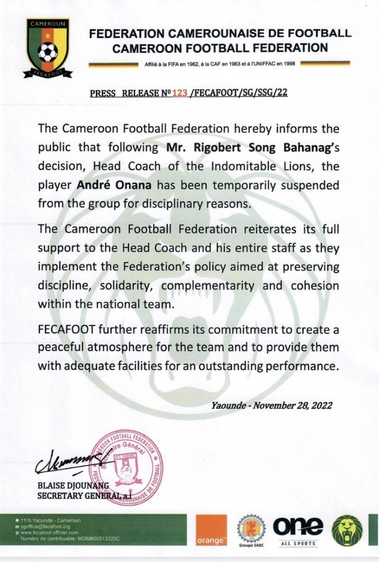 现在喀麦隆足协发公告表示:“喀麦隆足协在此通知公众,根据主教练的决定,球员安德烈-奥纳纳因纪律原因被暂时停赛。”