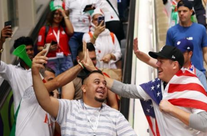 一名伊朗球迷和一名美国球迷在赛前相遇,两人身披国旗,友好击掌。