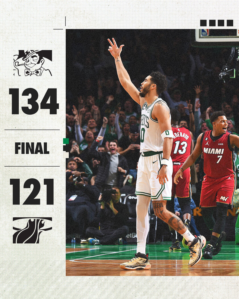 第四节,热火队连追4分,怀特回应三分,两队之后交替得分,凯尔特人队牢牢保持领先,布朗两次单打得手,霍福德又中三分,第四节还有4分45秒时凯尔特人队以123-115领先。热火队之后努力追分,塔图姆总能挺身而出给予还击,他又中2个三分球,凯尔特人队继续保持两位数优势,他们最终以134-121获胜。