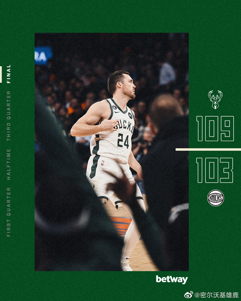 第四节,康诺顿命中三分,本节进行了4分钟时雄鹿队以86-79领先。巴雷特和雷迪什追回4分,字母哥三分还击,兰德尔和布伦森轮流得分,霍勒迪上篮得手,第四节还有4分55秒时雄鹿队以96-91领先。巴雷特连投带罚拿下4分追近,阿伦上篮得手,布伦森、罗宾逊和布伦森得到4分,第四节还有47.6秒时尼克斯队追成103平。阿伦三分命中,第四节还有30.9秒时雄鹿队以106-103领先。巴雷特错失三分,波蒂斯拿到篮板,尼克斯队采取犯规战术。霍勒迪两罚全中,兰德尔上篮不中,希尔两罚一中,雄鹿队以109-103获胜。