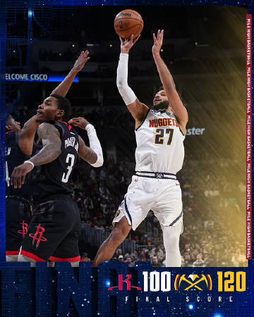 第四节,尼克斯、马修斯和申京联手7分缩小差距,火箭队以86-106落后。约基奇跳投回敬,穆雷左翼命中三分,掘金队把优势拉开到24分。此后的比赛没了悬念,双方都换上替补,掘金队以120-100获胜。
