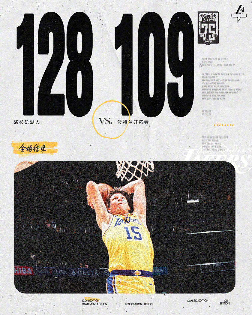 戴维斯这时挺身而出,连续两次补篮得手,温斯洛和西蒙斯还击4分,两队仍是13分差距。戴维斯强攻得手,同时造成温斯洛犯规,加罚命中,湖人队以125-109领先。开拓者队换下主力缴械,湖人队以128-109获胜。