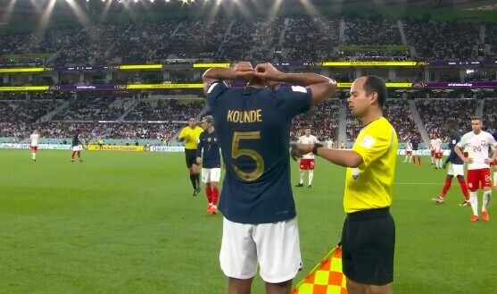 唯彩看球讯 法国vs波兰第42分钟,孔德的项链被边裁发现,边裁勒令他摘除项链。