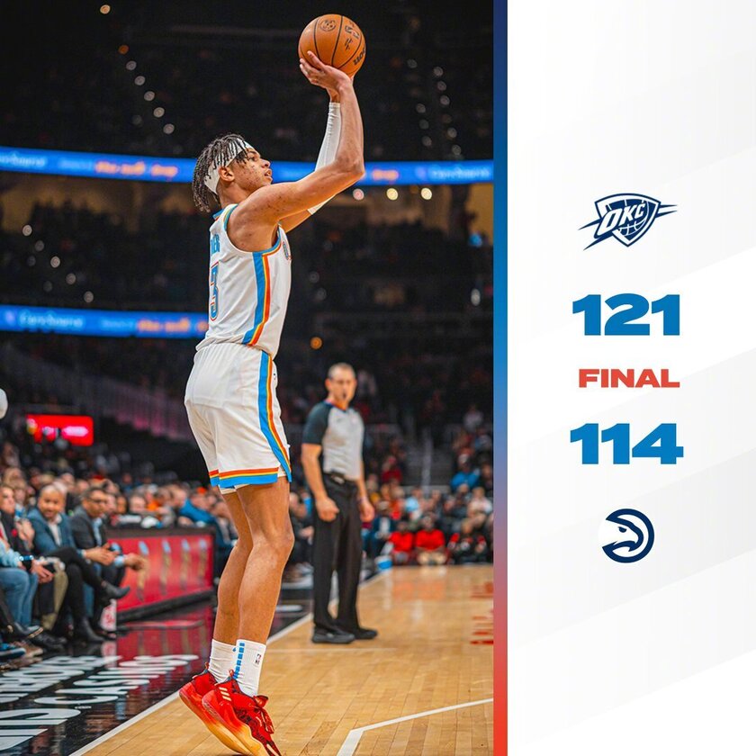 第四节,吉迪打3分成功率队连得9分,雷霆队以93-90反超。穆雷跳投还击,厄尔命中三分,穆雷跳投还击,亚历山大带领球队又拿8分,第四节还有2分50秒时雷霆队以107-98领先。杨打3分成功率队连追5分,亚历山大接管进攻还击5分,杨突破得手,穆雷弧顶命中三分,第四节还有50.5秒时老鹰队以108-113落后。最后时刻老鹰队无力回天,雷霆队以121-114获胜。