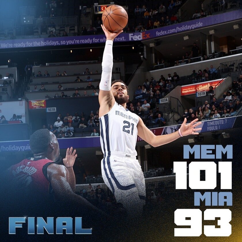 第四节,克拉克连得4分,灰熊队扩大优势。海史密斯三分命中,希罗扣篮得手,热火队把比分追近。阿尔达玛、琼斯、亚当斯和布鲁克斯轮流得分,灰熊队在第四节还有3分10秒时以97-86领先。巴特勒追回3分,亚当斯和阿尔达玛先后取分稳住局势。阿德巴约连追4分无济于事,热火队以93-101落败。