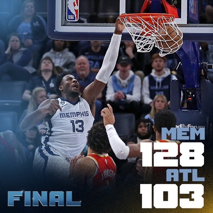 唯彩看球迅 NBA常规赛,孟菲斯灰熊队延续连胜。琼斯得到22分和11次助攻,布鲁克斯得到18分,他们率队7人得分上双,灰熊队逐渐确立大比分优势,他们在主场以128-103大胜亚特兰大老鹰队,灰熊队拿到6连胜。