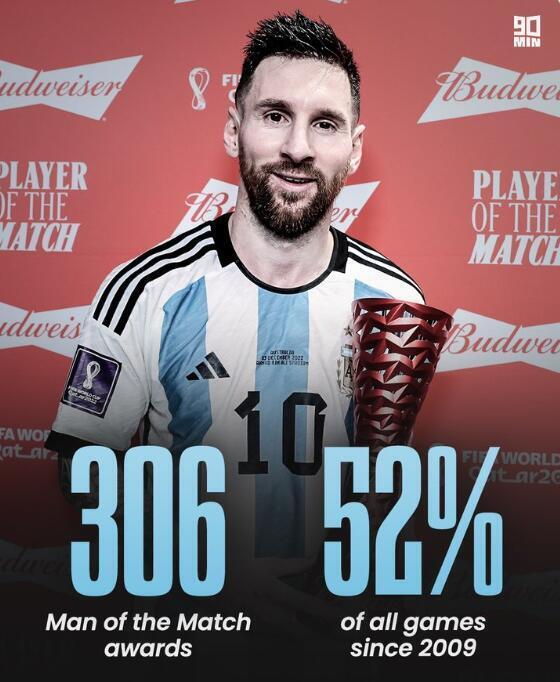 据媒体统计,自2009年以来,梅西已经306次获得了全场最佳,在他参加的所有比赛中占比高达52%。