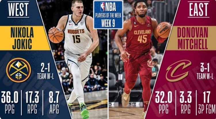 唯彩看球讯 今日,NBA官方公布了本赛季第9周东西部周最佳球员,约基奇和米切尔分别当选。