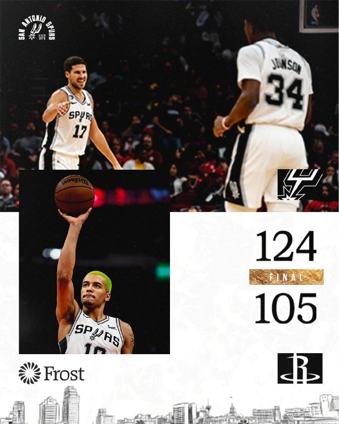 马刺队的攻势在第四节延续,他们又打出一波9-3的小高潮,领先优势拉开到22分。尼克斯和申京追回4分,马刺队立即还击4分稳住局势。之后的比赛马刺队顶住对手多次冲击保持领先,布兰哈姆跳投命中,第四节还有3分40秒时马刺队以122-98领先。火箭队最后时刻无力反攻,他们以105-124落败。