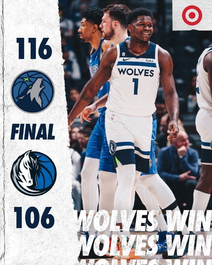 唯彩看球讯 NBA新赛季常规赛,明尼苏达森林狼队继续连胜。爱德华兹得到27分、13个篮板和9次助攻,里德得到27分和13个篮板,他们率队依靠二三节攻势实现反超并确立胜局,森林狼队在主场以116-106战胜达拉斯独行侠队,森林狼队拿到3连胜,独行侠队遭遇2连败。