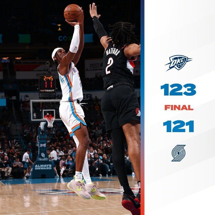 唯彩看球讯 NBA新赛季常规赛继续进行,俄克拉荷马城雷霆队(13胜18负)拿到连胜。亚历山大得到35分和6次助攻,他在终场前投中压哨绝杀,雷霆队在主场以123-121险胜波特兰开拓者队(17胜14负)。雷霆队拿到2连胜。