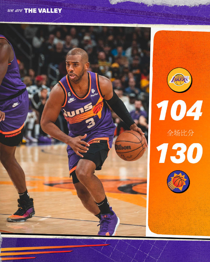 唯彩看球讯 NBA新赛季常规赛继续进行,洛杉矶湖人队结束连胜。保罗得到28分和8次助攻,艾顿得到21分和11个篮板,布里奇斯得到20分,他们率队早早确立大比分优势,菲尼克斯太阳队在主场以130-104大胜缺少了詹威的湖人队。太阳队拿到3连胜,湖人队结束2连胜。