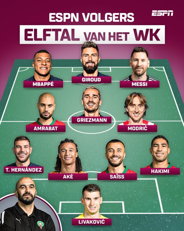唯彩看球讯 随着阿根廷点球大战击败法国登顶,卡塔尔世界杯落下帷幕。ESPN今日评选出本届世界杯的最佳阵容,其中吉鲁上榜,表现亮眼的新人格瓦迪奥尔、阿尔瓦雷斯和恩佐-费尔南德斯无缘。