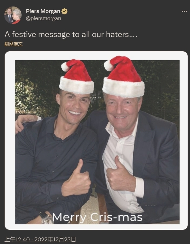 唯彩看球讯 值圣诞节来临之际,摩根在个人社媒晒出他和C罗的合照,两人头上都被P上圣诞帽子。