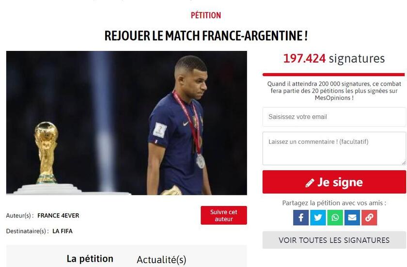 唯彩看球讯 世界杯决赛,法国点球大战不敌阿根廷,获得亚军。一球迷在请愿网站mesopinions发起请愿,要求世界杯决赛重踢。