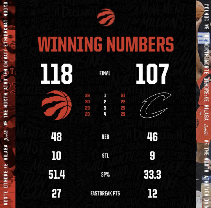第四节,米切尔三分命中,他率队连追7分,骑士队只落后13分。弗林三分还击,两队之后形成拉锯战,比分交替增加,猛龙队牢牢保持两位数优势,巴恩斯和西亚卡姆轮流得分,第四节还有1分50秒时他们以118-105领先。加兰两罚全中无济于事,骑士队以107-118落败。