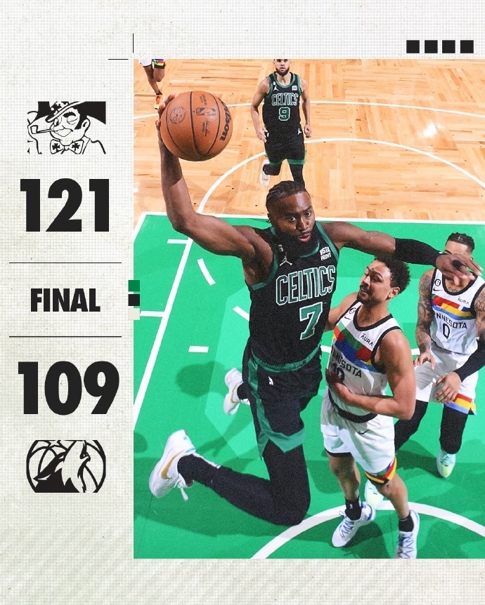 第四节,布朗和科内特联手6分,凯尔特人队以102-94领先。麦克丹尼尔斯两罚全中,布朗又进两球,凯尔特人队领先10分。戈贝尔两罚一中,森林狼队之后连续投篮打铁,布朗、霍福德和塔图姆轮流投中三分,第四节还有2分50秒时凯尔特人队以119-102领先。森林狼队最后时刻无力翻盘,凯尔特人队以121-109获胜。