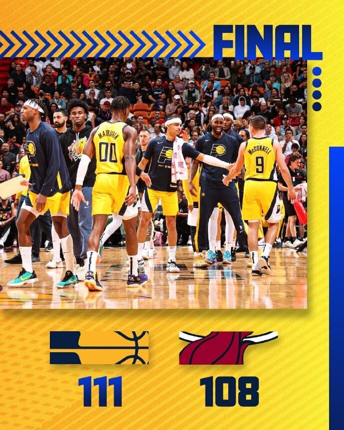 唯彩看球迅 NBA新赛季常规赛,印第安纳步行者队拿到连胜。哈利伯顿得到43分和7次助攻,他在终场前2.5秒投中制胜三分球让球队再次领跑。希罗错失扳平三分,步行者队在客场以111-108险胜迈阿密热火队,步行者队拿到2连胜,热火队遭遇2连败。