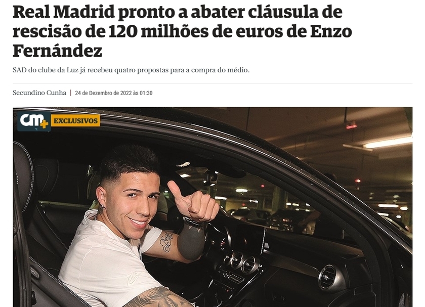 葡媒表示,皇马愿意支付恩佐-费尔南德斯的1.2亿欧解约金,让球员冬窗加盟俱乐部。另外,本菲卡还收到4份报价,金额从9700万欧元-1.1亿欧元不等,来自英格兰、法国、西班牙的俱乐部。