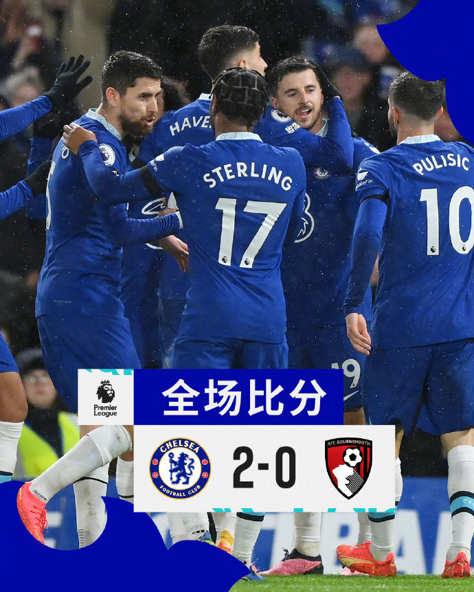 比赛结束,切尔西2-0战胜伯恩茅斯。