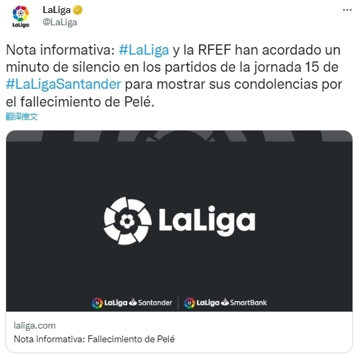 西甲官方:第15轮西甲比赛将默哀一分钟,以表达对贝利的哀悼